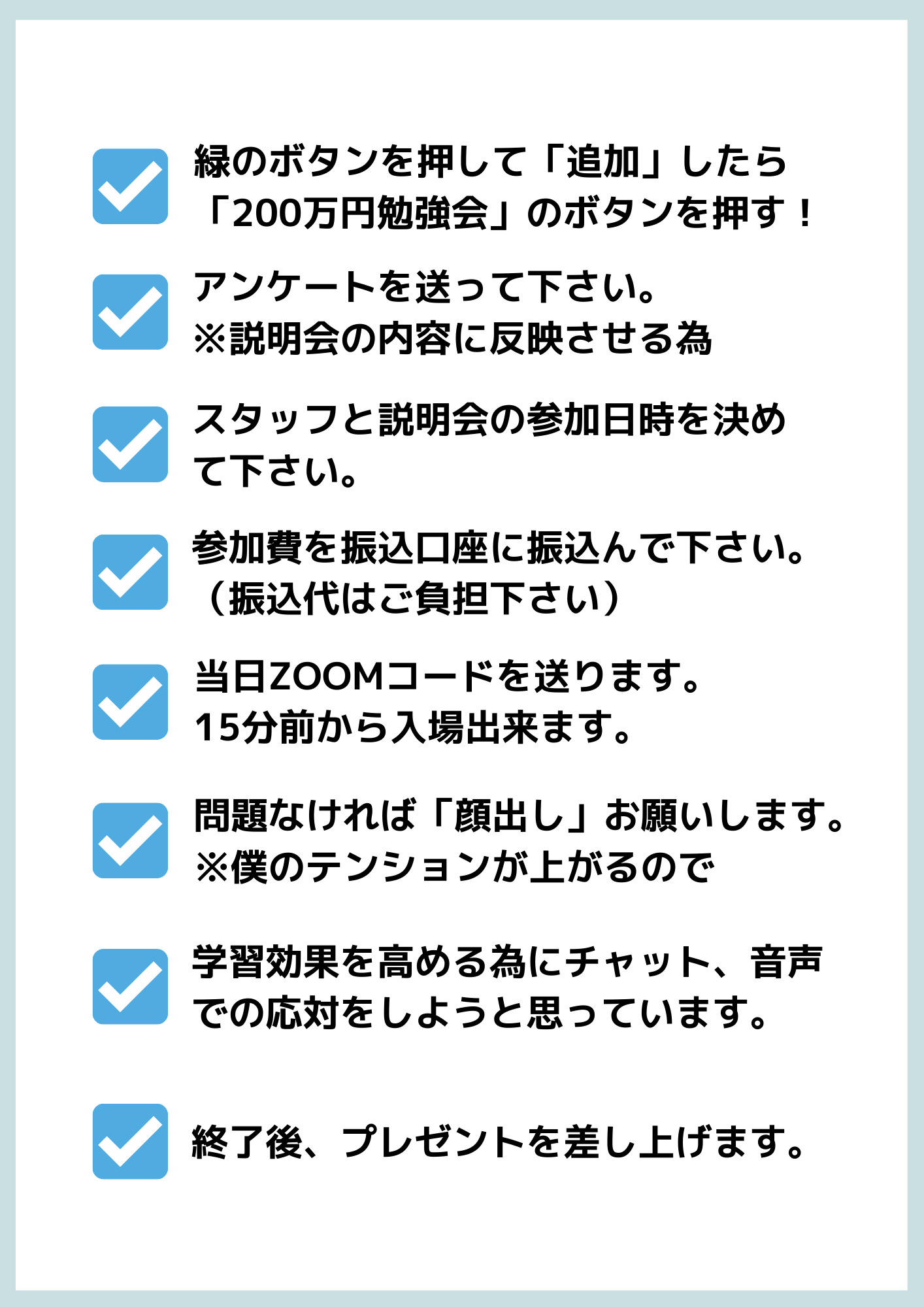 だから勉強会に参加して月に200万円利益がプラスした事を考えて、そうなったら「何がしたいか?」「何が欲しいか?」そんな事をイメージして参加して頂けたら「イメージ出来たら行動になります。」だから結果も出ます。
