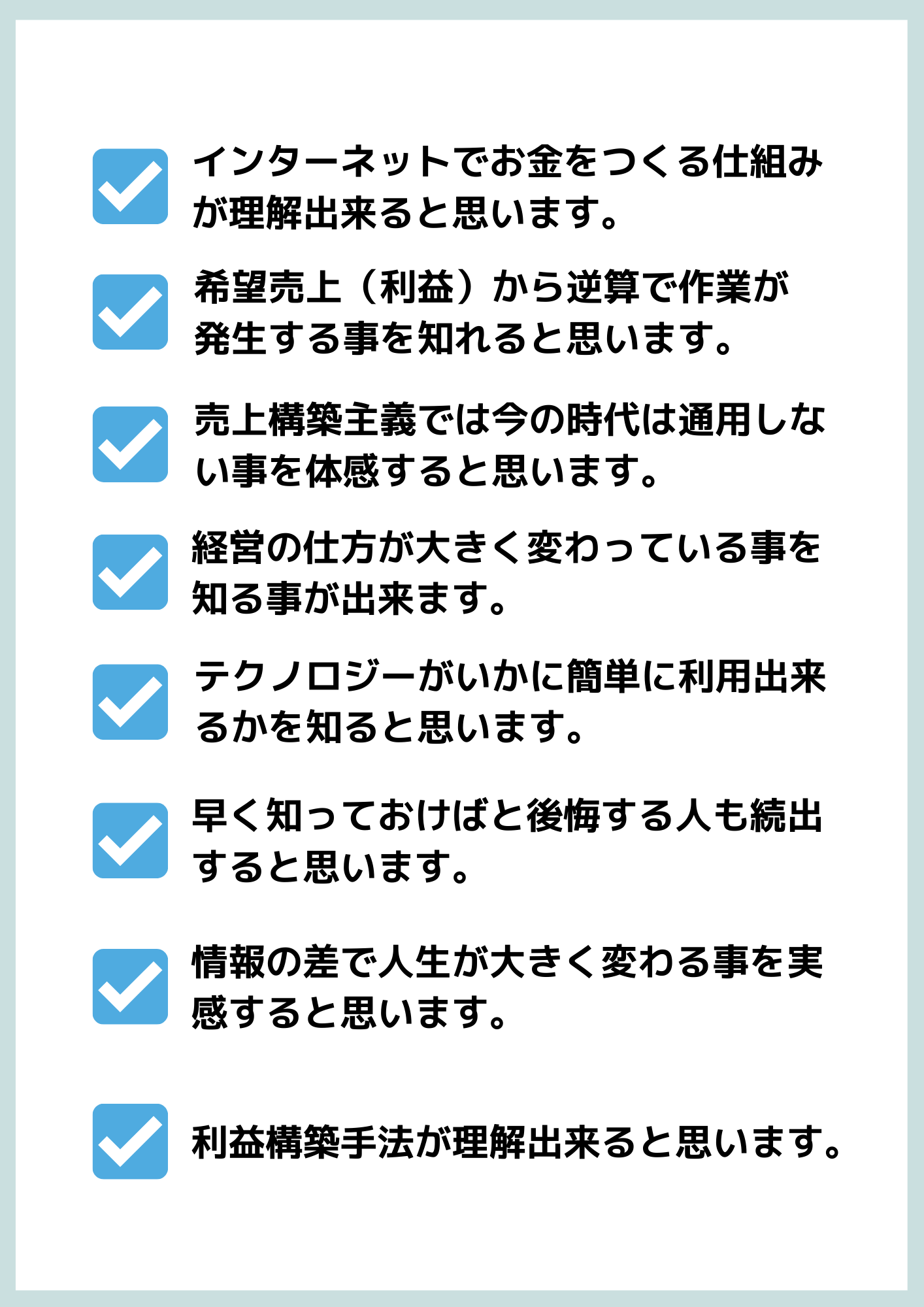 もし、もうそのくらいの「利益」は出ていると言う方がいれば500万円とか1,000万円を狙って下さい。このプログラムは地域とか立地とか一切関係なく出来るものなので安心して勉強会に参加してみて下さい。