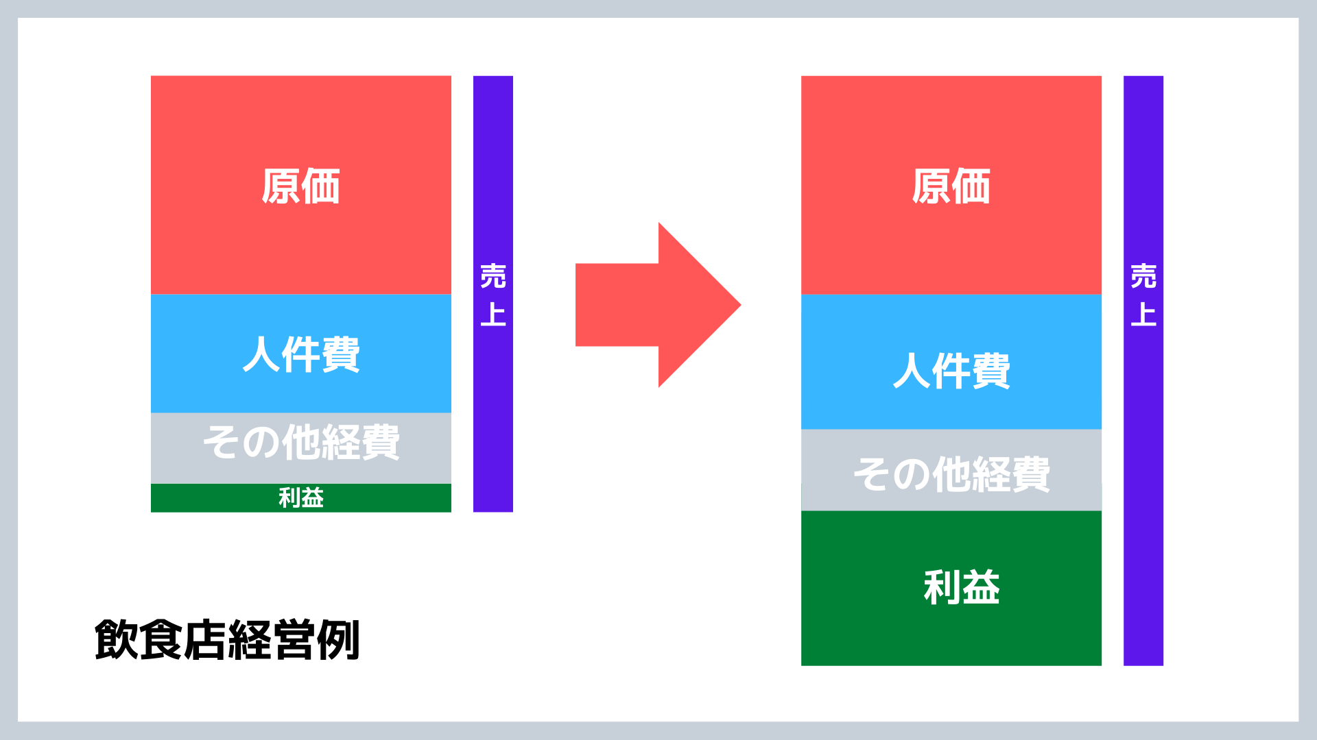 こんなイメージの改善を考えています。飲食店経営での利益は優秀な店舗で8%程度です。仮に月商500万円の店舗であったら40万円程度です。これを単純に「売上構築型」で240万円出そうと思えば単純計算になりますが3,000万円の月商が必要になります。